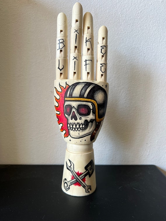 Wooden Hand With A Biker Skull Tattoo Design Etsy Uk
